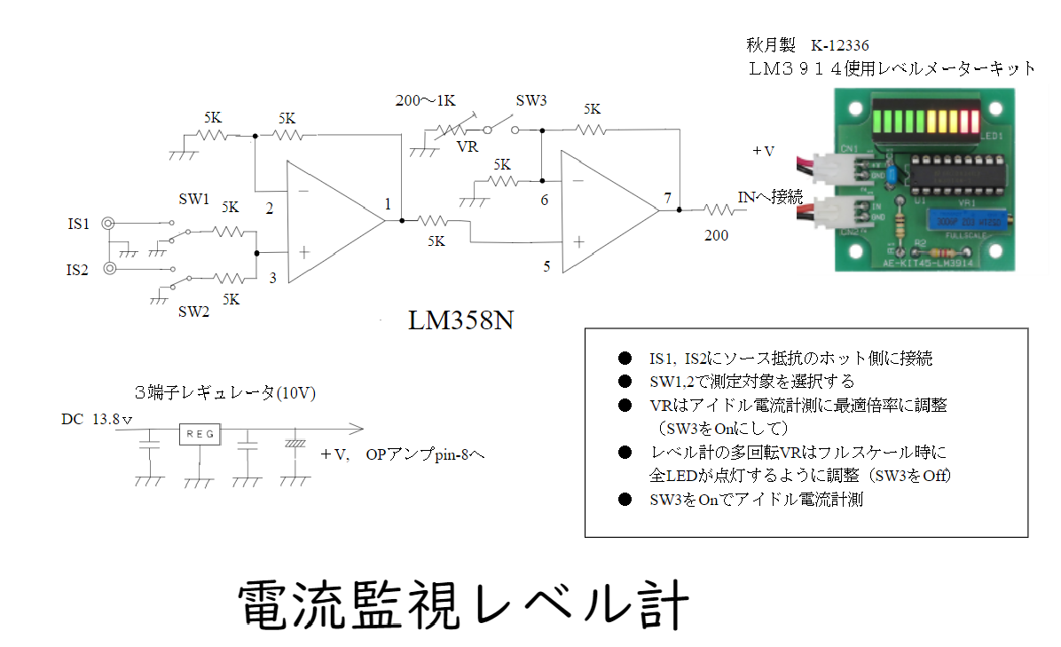 ドレイン電流のピーク値を大まかに把握できればと考え、LEDレベル計基板(10段階)を使って電流計を製作しました。(LEDレベル計基板は秋月で550円で入手)回路図を以下に示します。(画像クリックで拡大表示)