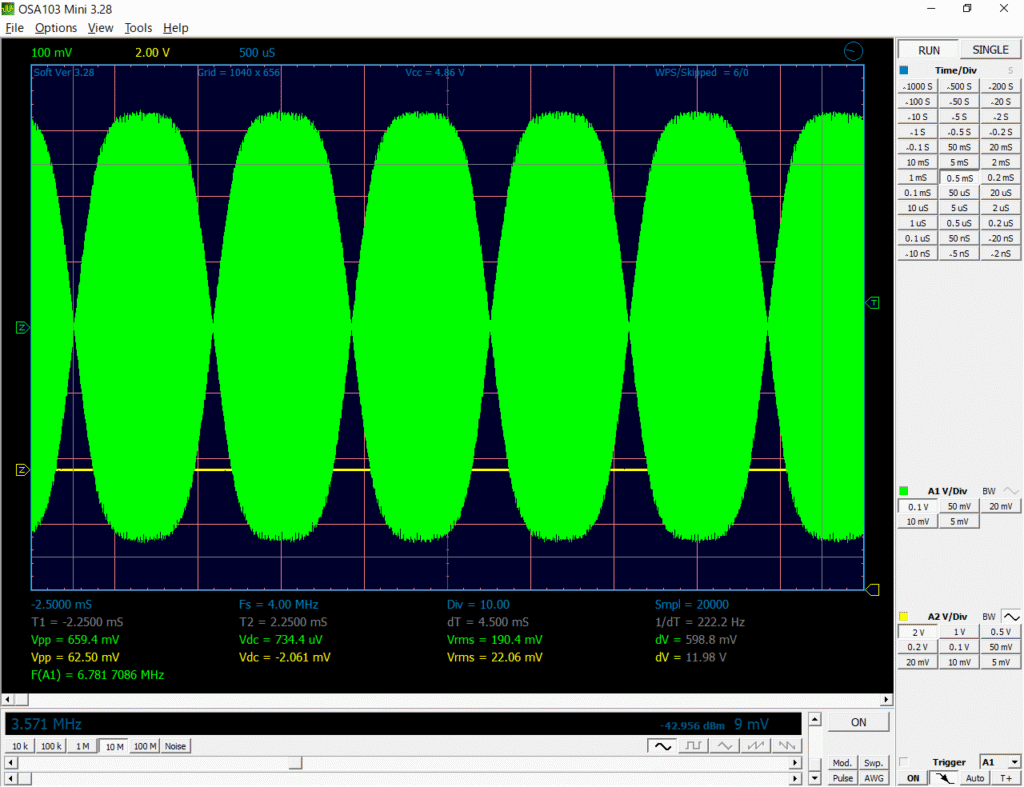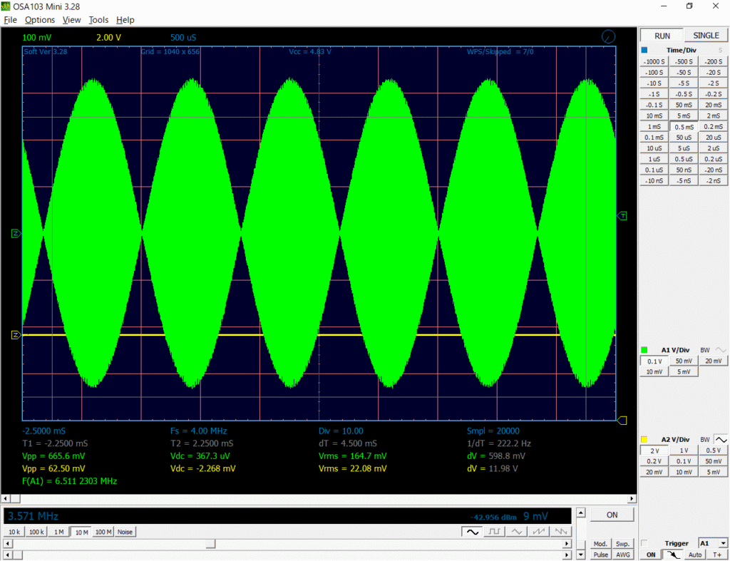 この特性で2トーン波形ではどんなものか。興味あるところ。プリディストーションのON・OFFで2トーン波形を比較してみた。