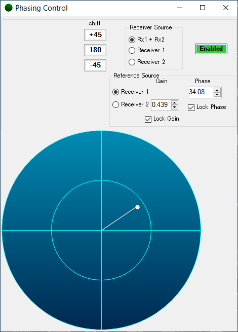 3.下部の円グラフ内の●印をドラッグして、振幅・位相を調整してノイズを最小に調整する。振幅の補正の半固定VRも適宜調整する。以下にキャンセラON, OFF時のPOWER-SDRのバンドスコープ画面を示します。