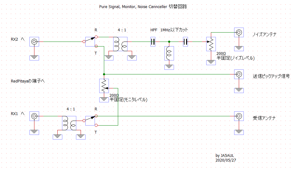 上図では、Puresignal, Monitor, 受信アンテナを送受切り替えて、現在まで使用している諸機能を引き継ぐようにしています。ノイズアンテナからの信号は、HPFを通過させ数百キロヘルツ以下の成分を減衰させています。これがないと、インバータノイズはキャンセルできるものの、新たな雑音が加わり、何となく雑音ぽくなったため追加しました。