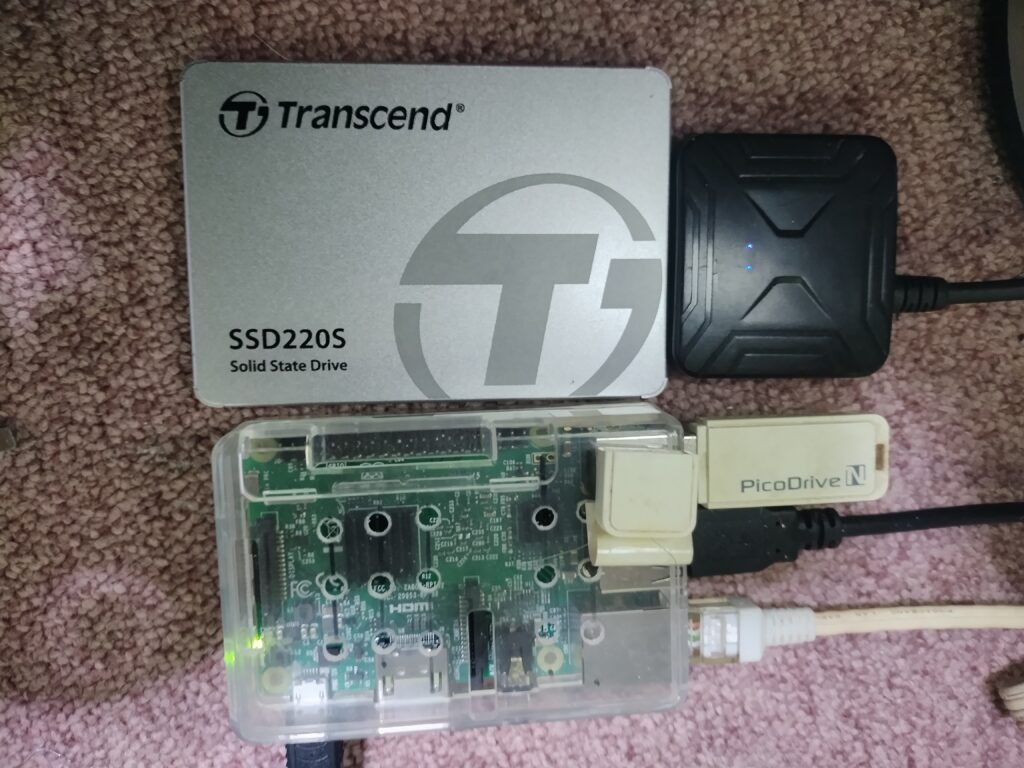 前述のRaspberry Pi Zeroの経験からSDカードの寿命をSSD装備で解決した構成とした。中古で入手したRaspberry Pi 3 BとSSD(120G)の構成である。64ビットOSでRaspbianというOSで、debianやubuntuと共通するところが多く、乗り換えにはそんなに手数はかからなかった。