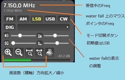 上図受信機パネル中には、受信操作に必要な周波数表示や操作ボタン、スライダーが配置されています。図中の受信中のFreqは受信中の周波数(搬送波)を、water fall上のマウスポインタのFreqは現在のマウスポインタの位置に対応した周波数を示しています。受信帯域マーカの位置が受信中のFreqを示しています。そのほか、water faill調節のスライダ2つ、音量調整スライダーなどがあります。ここで得られる情報をもとに、操作法のポイントを列記すると。。