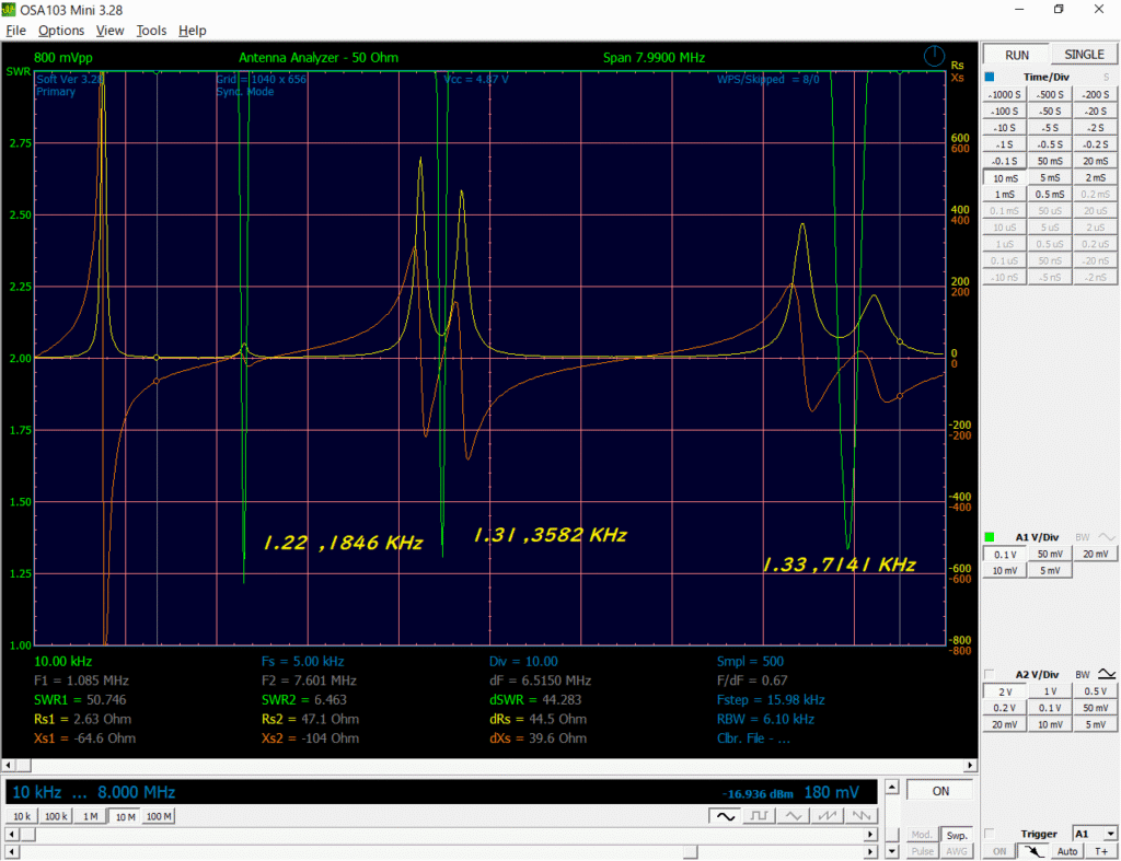 アンテナアナライザとして、現用の1.8/3.5/7メガの3バンド逆vアンテナの特性を測定してみた。