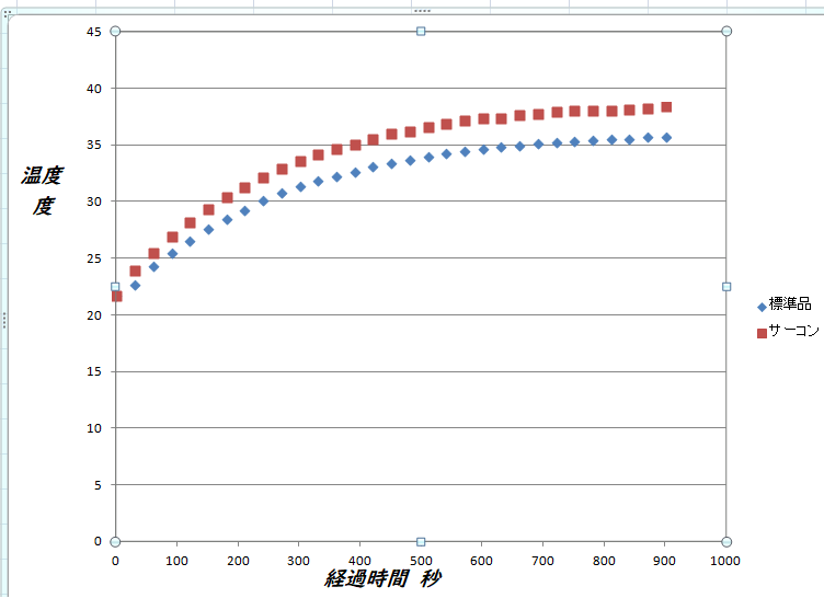 MOS-FETに2W程度(10V, 0.2A)の熱損失を発生し各々のシリコンラバーを介した小型放熱器(アルミ製)の温度上昇を30秒毎、15分間測定したものです。下記に結果を示します。