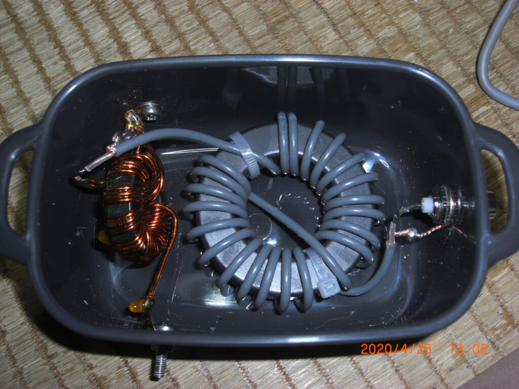 この強制バランに新たに同軸ケーブル(1.5D2v,FT240-43)で作ったフロートバランをシリーズに接続し100均のタッパー容器に入れてみた。